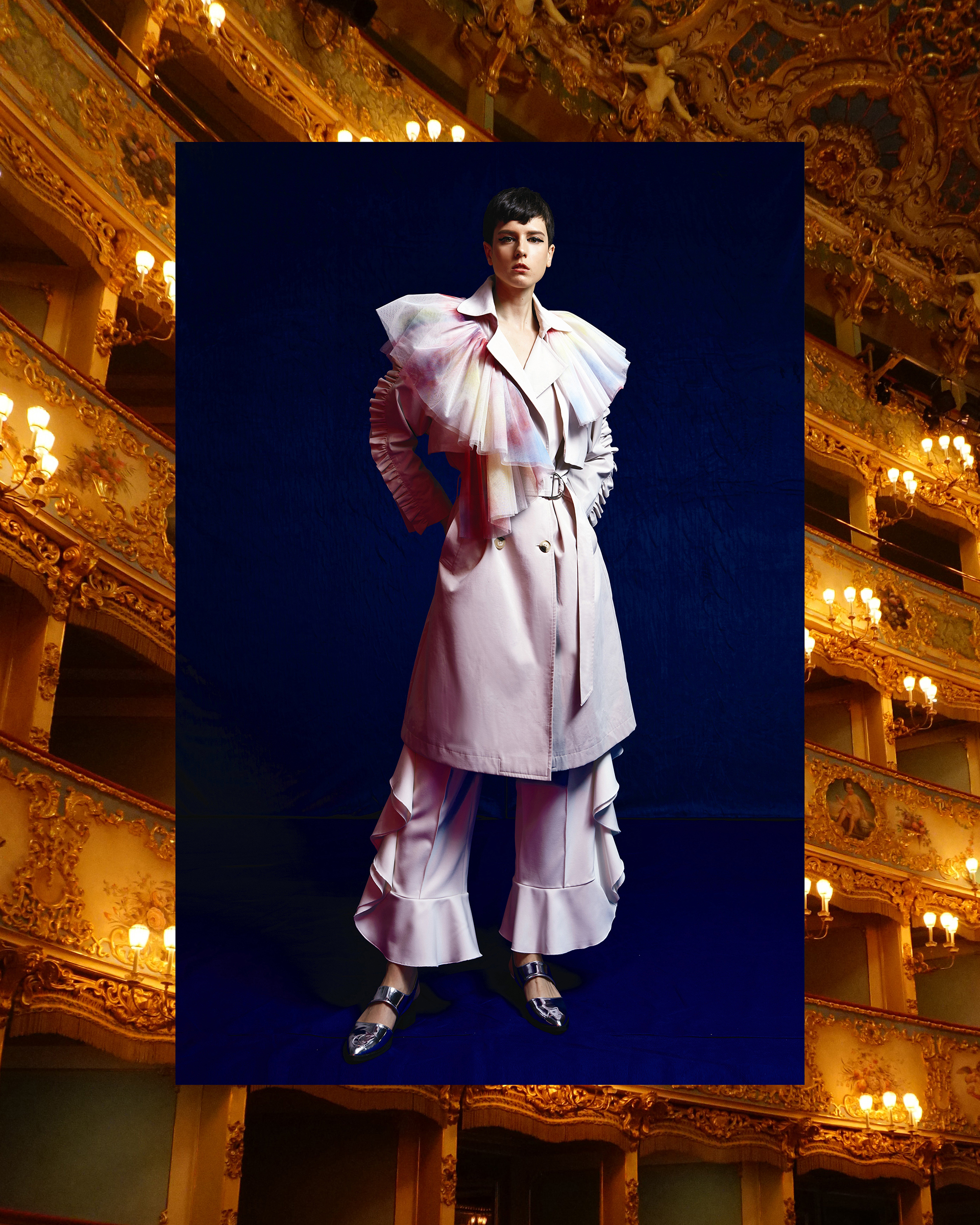 那是一件在領口兩旁散落著薄紗荷葉邊的 HEAVEN PLEASE 束腰 Trench Coat。